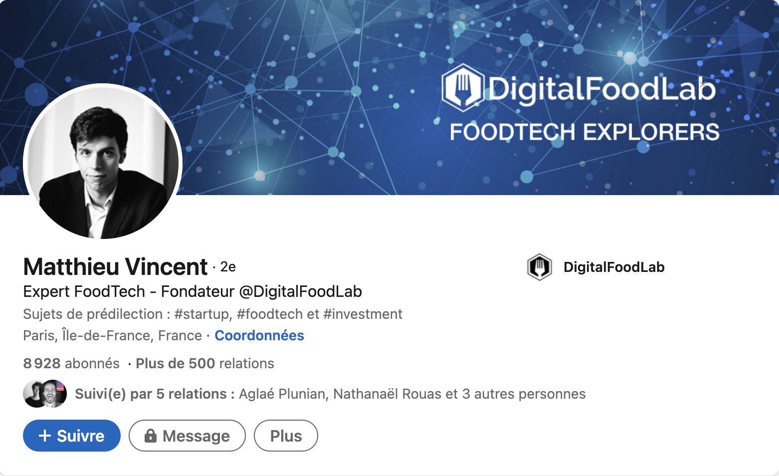 Entrepreneur et expert de la FoodTech, Matthieu Vincent est aussi le co-fondateur du cabinet de conseil DigitalFoodLab. Grâce à sa casquette d’entrepreneur, l’influenceur LinkedIn (15K abonnés) partage un contenu pointu sur la distribution, l’agro-alimentaire, et les dernières innovations en matière de restauration !